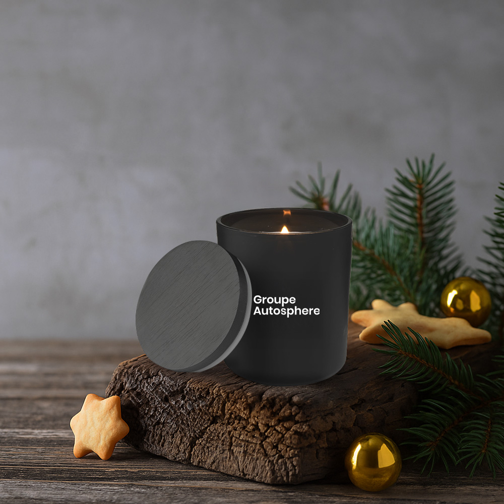 Bougie parfumée décorative moulée dans un verre coloré avec une belle finition mate et scellée avec un couvercle en bois décoratif.